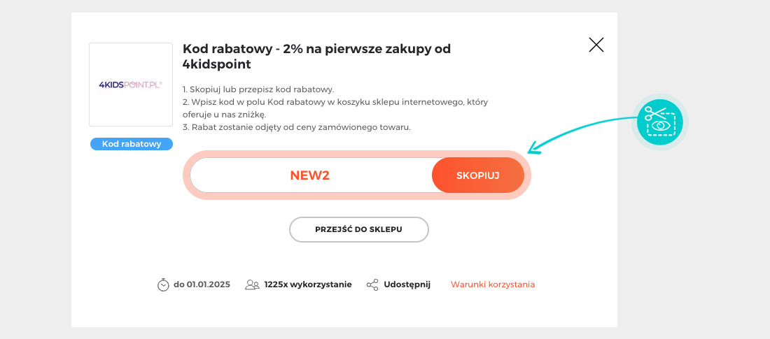 Wybierzcie na naszej stronie konkretny kod rabatowy, którego chcecie użyć w sklepie internetowym 4kidspoint.pl. Następnie kliknijcie pomarańczowy przycisk "Wyświetl kod".