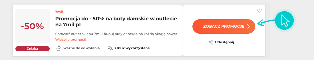 Wybierz konkretny rabat 7mil na naszej stronie i kliknij przycisk "Zobacz promocje". Zostaniesz automatycznie przekierowany bezpośrednio do oferty specjalnej w sklepie internetowym 7mil.pl, w którym możesz kupić produkt ze zniżką.