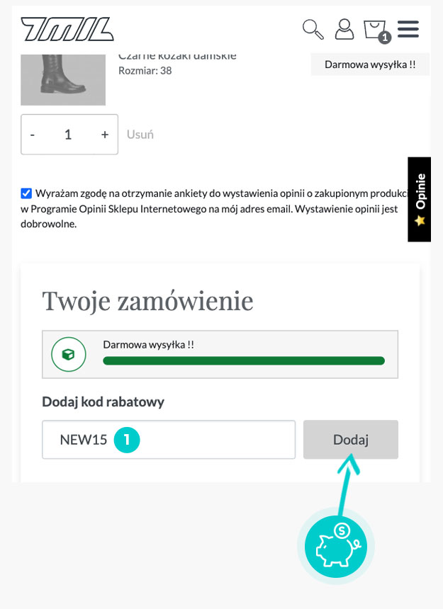 Wybierz produkt w e-sklepie 7mil.pl który Cię interesuje, naciśnij przycisk "Kup", a produkt zostanie automatycznie dodany do koszyka. Bezpośrednio w koszyku znajdziesz pole „Kupon podarunkowy lub rabatowy” pod wybranym produktem. Wpisz tutaj skopiowany kod rabatowy lub wprowadź go ręcznie i potwierdź przyciskiem „Zastosuj”.