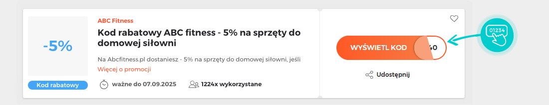 Wybierz na naszej stronie określony kod rabatowy, który chcesz zastosować w sklepie internetowym ABCfitness.pl. Kliknij pomarańczowy przycisk „Wyświetl kod”.