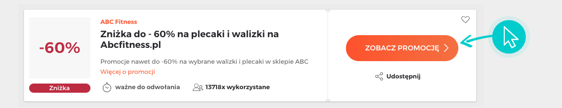Wybierz konkretny rabat ABC fitness na naszej stronie i kliknij przycisk "Zobacz promocje". Zostaniesz automatycznie przekierowany bezpośrednio do oferty specjalnej w sklepie internetowym ABCfitness.pl, w którym możesz kupić produkt ze zniżką.