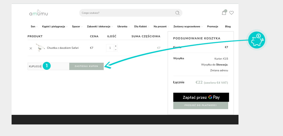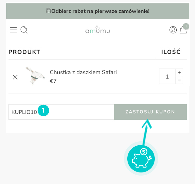 Wybierz produkt w e-sklepie Amumu.pl który Cię interesuje, naciśnij przycisk "Kup", a produkt zostanie automatycznie dodany do koszyka. Bezpośrednio w koszyku znajdziesz pole „Kupon podarunkowy lub rabatowy” pod wybranym produktem. Wpisz tutaj skopiowany kod rabatowy lub wprowadź go ręcznie i potwierdź przyciskiem „Zastosuj”.