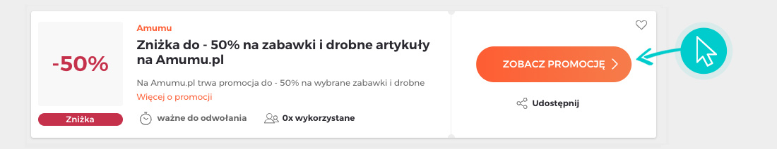 Wybierz konkretny rabat Amumu na naszej stronie i kliknij przycisk "Zobacz promocje". Zostaniesz automatycznie przekierowany bezpośrednio do oferty specjalnej w sklepie internetowym Amumu.pl, w którym możesz kupić produkt ze zniżką.