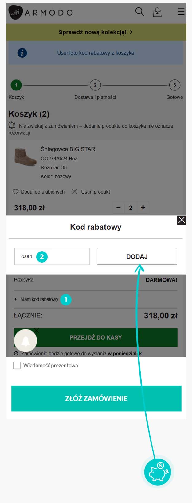 Czytaj więcej ...Nie wiesz dokładnie, jak działają kody rabatowe na Armodo.pl? Oto jak szybko i łatwo zastosować kody rabatowe podczas dokonywania zakupu: