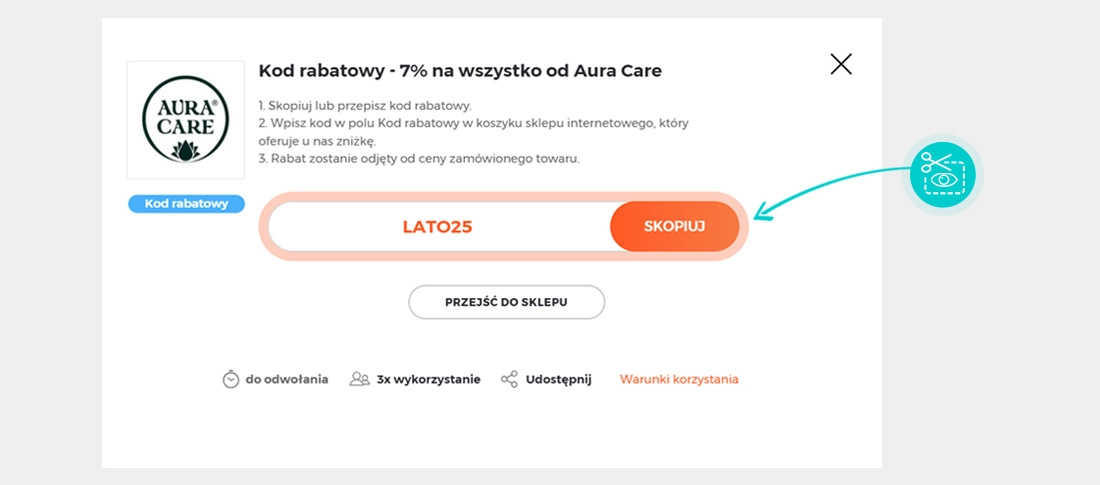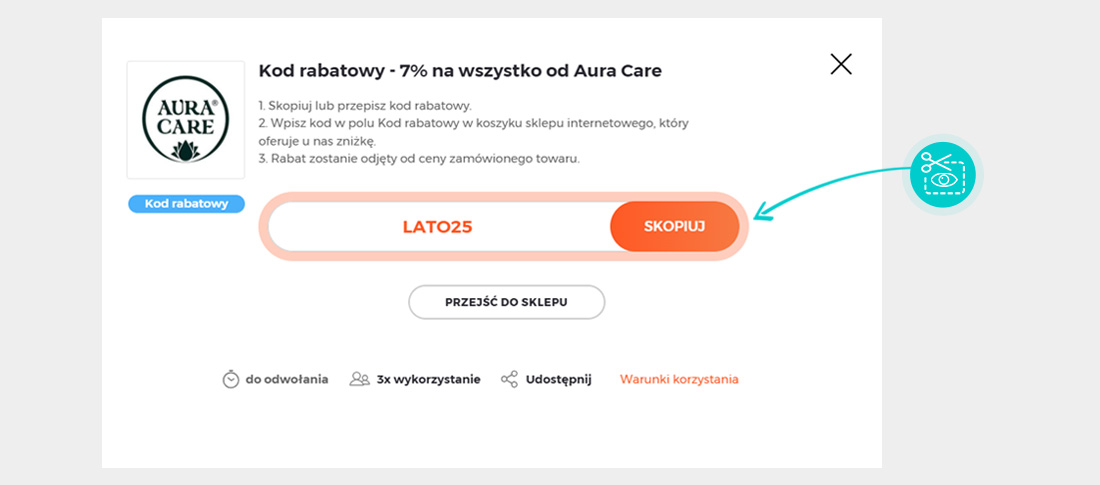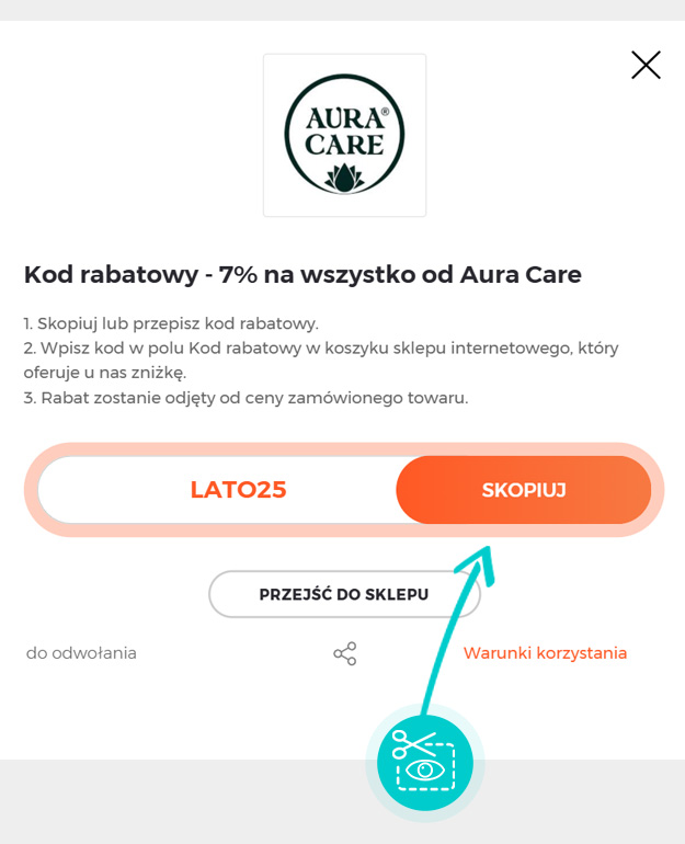 Skopiuj lub zapisz kod rabatowy i kliknij przycisk "Przejdź do sklepu". Nastąpi przekierowanie bezpieśrednio do sklepu internetowego Auracare.pl.