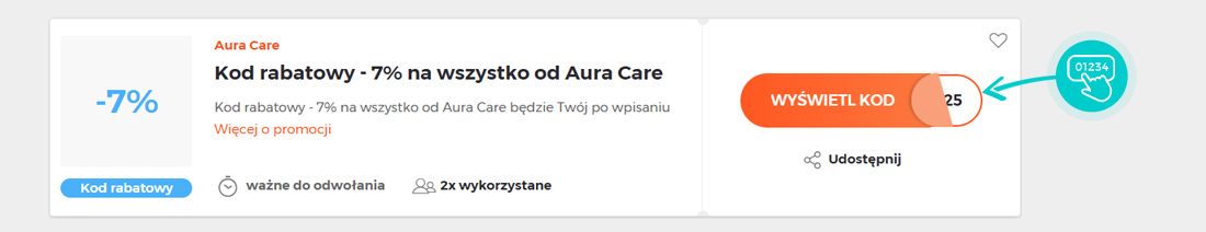 Wybierz na naszej stronie określony kod rabatowy, który chcesz zastosować w sklepie internetowym Auracare.pl. Kliknij pomarańczowy przycisk „Wyświetl kod”.