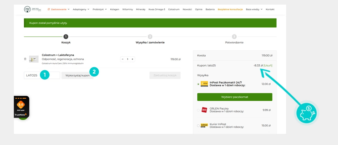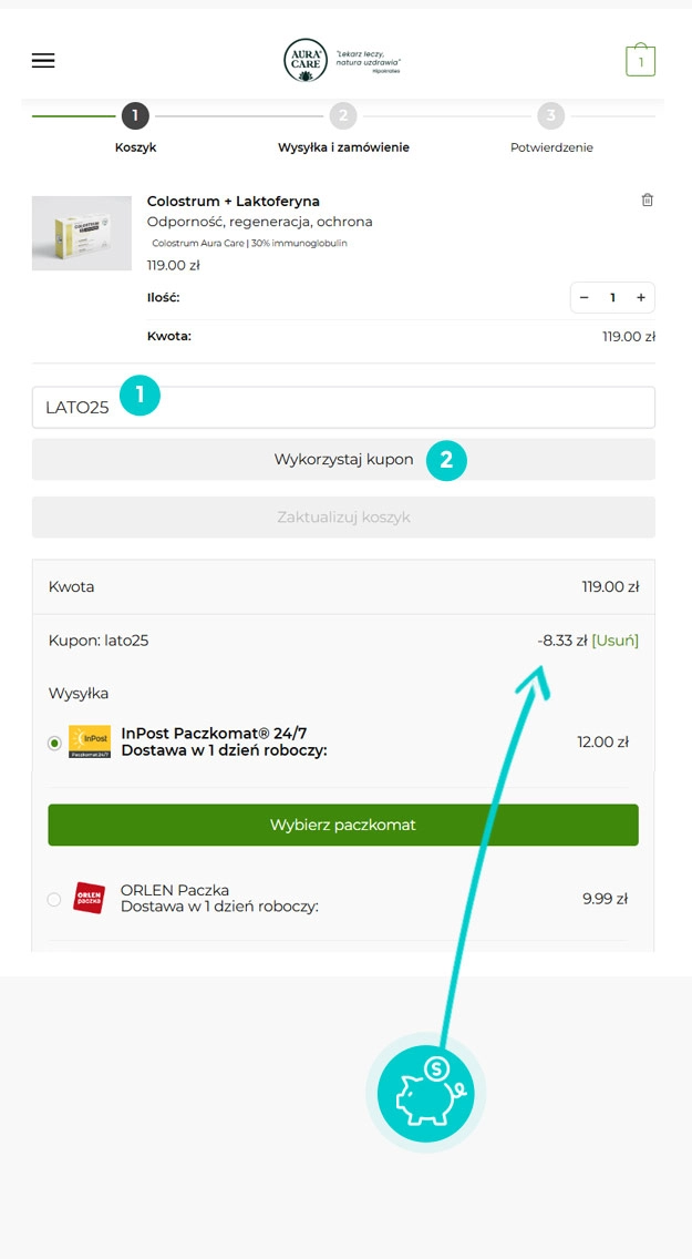 Wybierz produkt w e-sklepie Auracare.pl który Cię interesuje, naciśnij przycisk "Kup", a produkt zostanie automatycznie dodany do koszyka. Bezpośrednio w koszyku znajdziesz pole „Kupon podarunkowy lub rabatowy” pod wybranym produktem. Wpisz tutaj skopiowany kod rabatowy lub wprowadź go ręcznie i potwierdź przyciskiem „Zastosuj”.