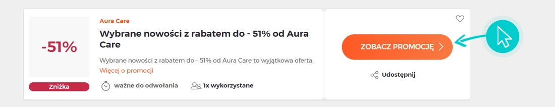 Wybierz konkretny rabat Aura Care na naszej stronie i kliknij przycisk "Zobacz promocje". Zostaniesz automatycznie przekierowany bezpośrednio do oferty specjalnej w sklepie internetowym Auracare.pl, w którym możesz kupić produkt ze zniżką.