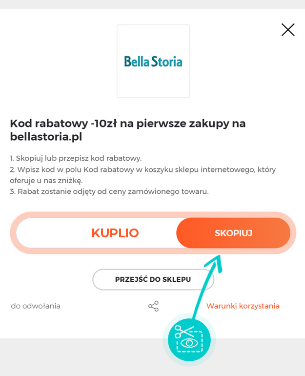 Wybierz na naszej stronie określony kod rabatowy, który chcesz zastosować w sklepie internetowym Bellastoria.pl. Kliknij pomarańczowy przycisk „Wyświetl kod”.
