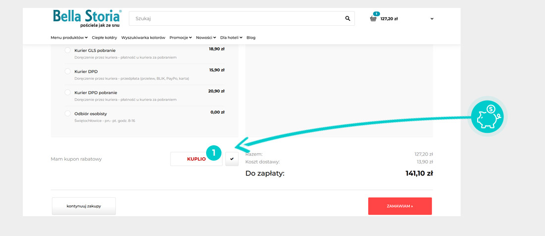 Wybierz produkt w e-sklepie Bellastoria.pl który Cię interesuje, naciśnij przycisk "Kup", a produkt zostanie automatycznie dodany do koszyka. Bezpośrednio w koszyku znajdziesz pole „Kupon podarunkowy lub rabatowy” pod wybranym produktem. Wpisz tutaj skopiowany kod rabatowy lub wprowadź go ręcznie i potwierdź przyciskiem „Zastosuj”.