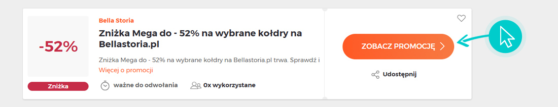 Wybierz konkretny rabat Bella Storia na naszej stronie i kliknij przycisk "Zobacz promocje". Zostaniesz automatycznie przekierowany bezpośrednio do oferty specjalnej w sklepie internetowym Bellastoria.pl, w którym możesz kupić produkt ze zniżką.