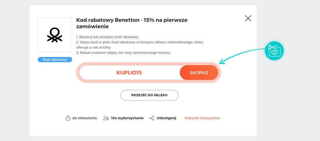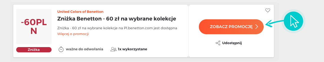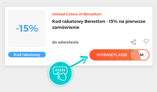 Wybierz na naszej stronie konkretny kod rabatowy, którego chcesz użyć w sklepie internetowym Benetton.com. Następnie kliknij pomarańczowy przycisk "Wyświetl kod".