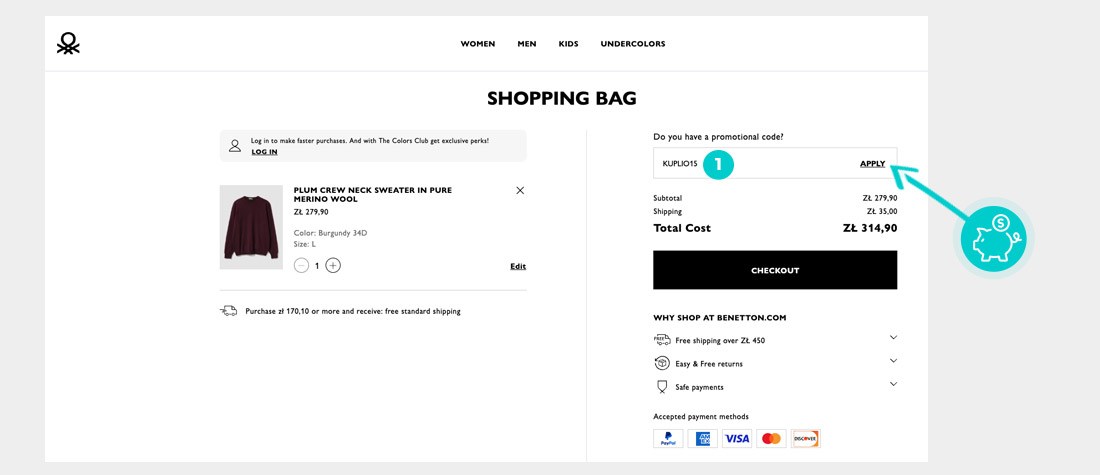 Wybierz w e-sklepie Benetton.com produkt, który Cię interesuje, naciśnij przycisk "Dodaj do koszyka", a produkt automatycznie zostanie dodany do Twojego koszyka z zamówieniem. Po prawej stronie, w sekcji "Koszyk" znajdziesz pole "Wprowadź kod promocyjny". Tutaj wklej skopiowany kod rabatowy bądź wprowadź go ręcznie, i zatwierdź przyciskiem, a następnie przejdź dalej.