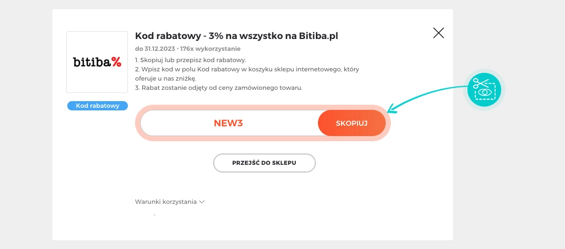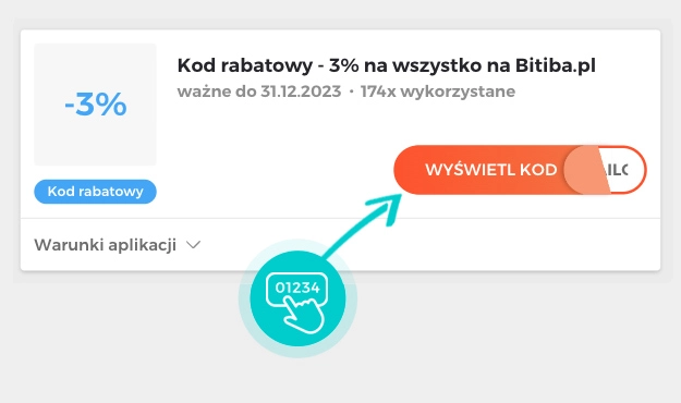 Skopiuj lub zapisz kod rabatowy i kliknij przycisk "Przejdź do sklepu". Nastąpi przekierowanie bezpośrednio do sklepu internetowego Bitiba.pl.
