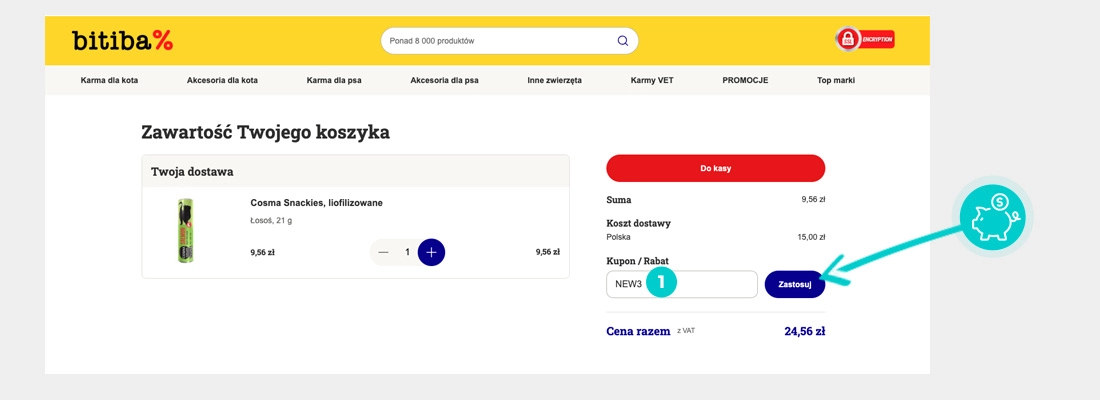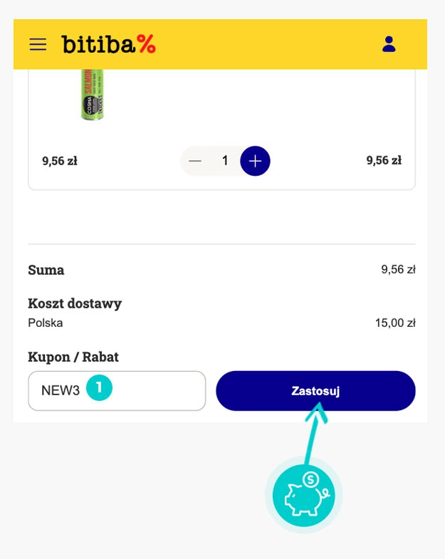 Wybierz produkt w e-sklepie Bitiba.pl który Cię interesuje, naciśnij przycisk "Kup", a produkt zostanie automatycznie dodany do koszyka. Bezpośrednio w koszyku znajdziesz pole „Kupon podarunkowy lub rabatowy” pod wybranym produktem. Wpisz tutaj skopiowany kod rabatowy lub wprowadź go ręcznie i potwierdź przyciskiem „Zastosuj”.