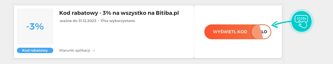 Wybierz na naszej stronie określony kod rabatowy, który chcesz zastosować w sklepie internetowym Bitiba.pl. Kliknij pomarańczowy przycisk „Wyświetl kod”.