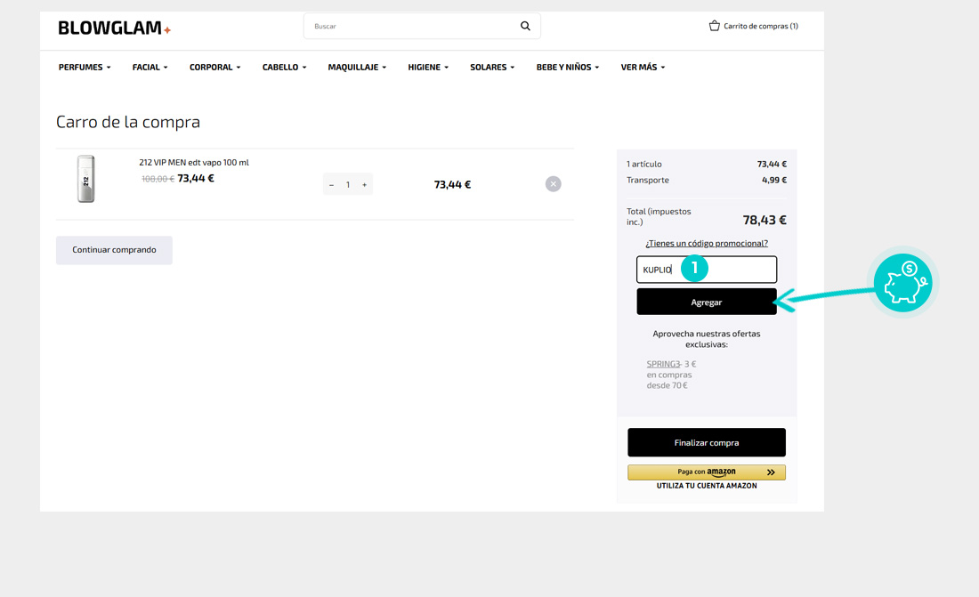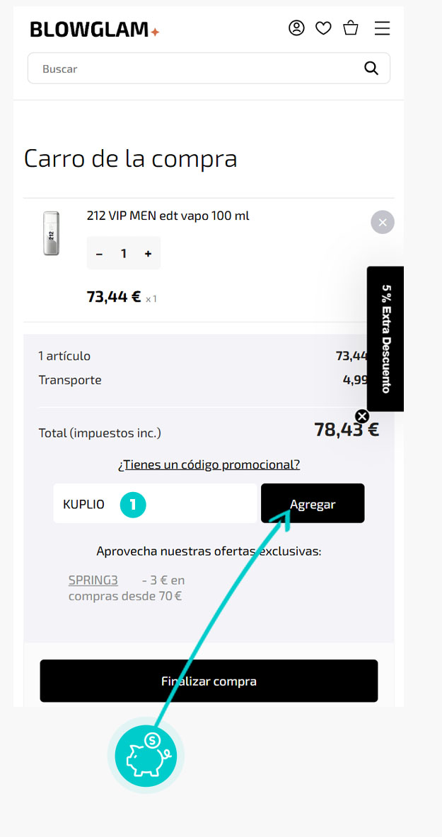 Wybierz w e-sklepie Blowglam.com produkt, który Cię interesuje, naciśnij przycisk "Dodaj do koszyka", a produkt automatycznie zostanie dodany do Twojego koszyka z zamówieniem. Po prawej stronie, w sekcji "Koszyk" znajdziesz pole "Kod promocyjny". Tutaj wklej skopiowany kod rabatowy bądź wprowadź go ręcznie, i zatwierdź przyciskiem "Dodaj", a następnie zaznacz "Dokonanie zakupu".