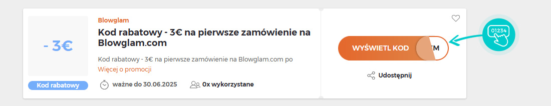 Wybierz na naszej stronie konkretny kod rabatowy, którego chcesz użyć w sklepie internetowym Blowglam.com. Następnie kliknij pomarańczowy przycisk "Wyświetl kod".