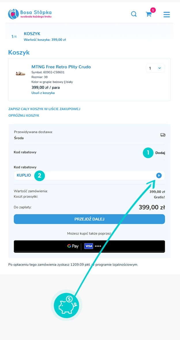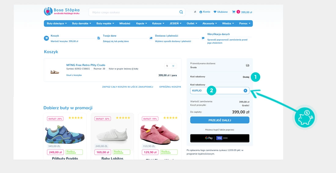 Wybierz produkt w e-sklepie Bosastopka.pl który Cię interesuje, naciśnij przycisk "Kup", a produkt zostanie automatycznie dodany do koszyka. Bezpośrednio w koszyku znajdziesz pole „Kupon podarunkowy lub rabatowy” pod wybranym produktem. Wpisz tutaj skopiowany kod rabatowy lub wprowadź go ręcznie i potwierdź przyciskiem „Zastosuj”.