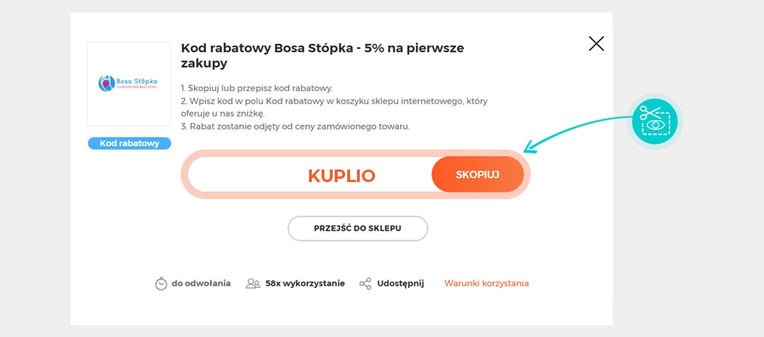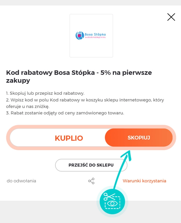 Skopiuj lub zapisz kod rabatowy i kliknij przycisk "Przejdź do sklepu". Nastąpi przekierowanie bezpieśrednio do sklepu internetowego Bosastopka.pl.