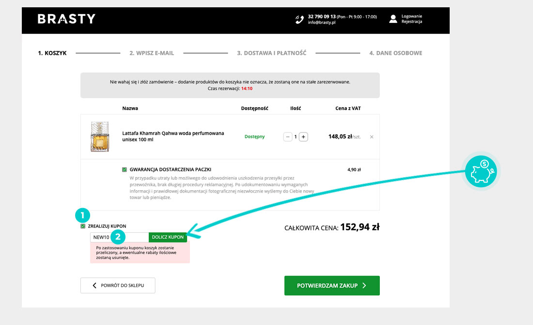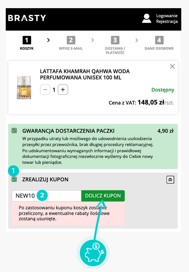 Wybierz w e-sklepie Brasty.pl produkt, który Cię interesuje, naciśnij przycisk "Do koszyka", a produkt automatycznie zostanie dodany do Twojego koszyka z zamówieniem. Po prawej stronie, w sekcji "Koszyk" znajdziesz pole "Zrealizuj kupon". Tutaj wklej skopiowany kod rabatowy bądź wprowadź go ręcznie, i zatwierdź przyciskiem "Dolicz kupon", a następnie zaznacz "Potwierdzam zakup".