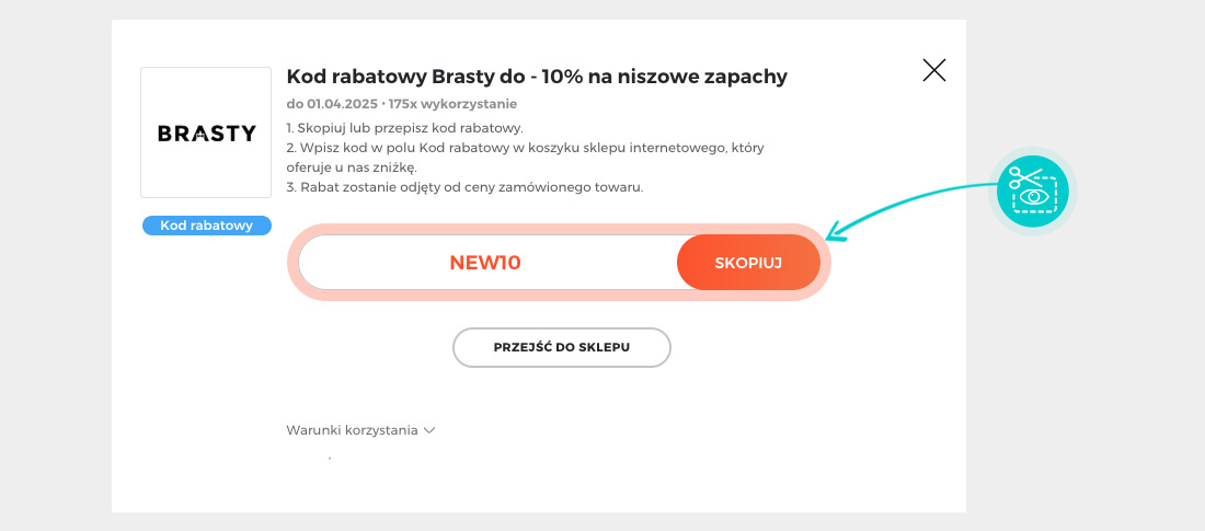 Skopiuj lub zapisz kod rabatowy, a następnie kliknij przycisk "Przejdź do sklepu". Zostaniesz automatycznie przekierowany do sklepu internetowego Brasty.pl.