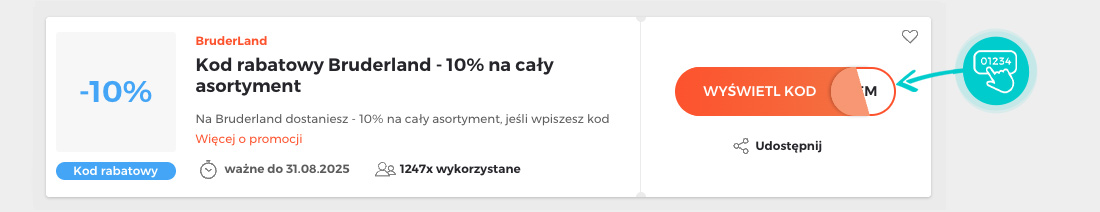 Wybierz na naszej stronie określony kod rabatowy, który chcesz zastosować w sklepie internetowym Bruderland.pl. Kliknij pomarańczowy przycisk „Wyświetl kod”.
