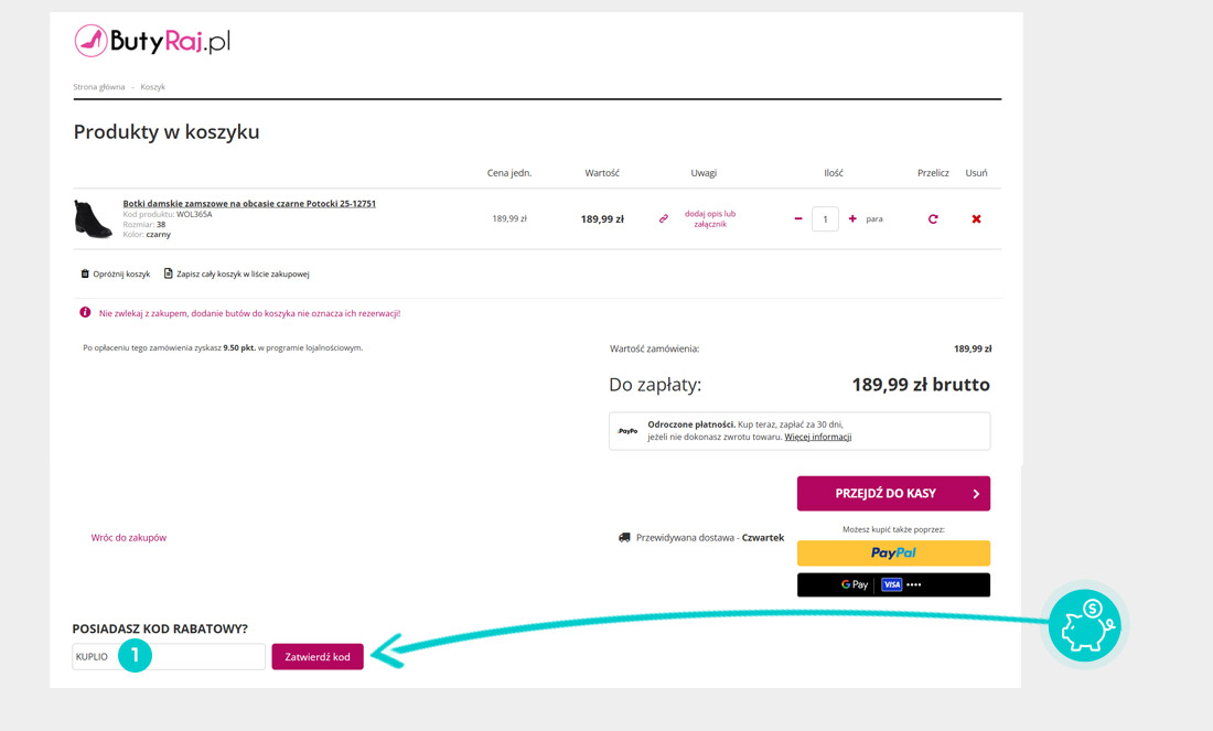 Wybierzcie konkretny rabat z ButyRaj na naszej stronie i kliknijcie przycisk "Zobacz promocję". Zostaniecie automatycznie przekierowani do oferty promocyjnej w sklepie internetowym Butyraj.pl, gdzie możecie kupić wybrany produkt ze świetną zniżką.