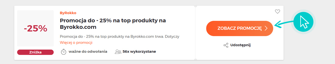 Wybierz konkretny rabat ByRokko na naszej stronie i kliknij przycisk "Zobacz promocje". Zostaniesz automatycznie przekierowany bezpośrednio do oferty specjalnej w sklepie internetowym Byrokko.com, w którym możesz kupić produkt ze zniżką.