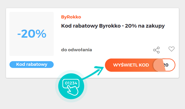 Wybierz na naszej stronie określony kod rabatowy, który chcesz zastosować w sklepie internetowym Byrokko.com. Kliknij pomarańczowy przycisk „Wyświetl kod”.