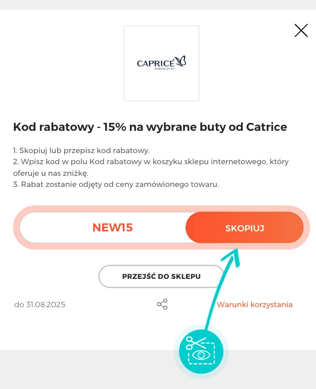 Skopiuj lub zapisz kod rabatowy i kliknij przycisk "Przejdź do sklepu". Nastąpi przekierowanie bezpieśrednio do sklepu internetowego Capriceshoes.com.