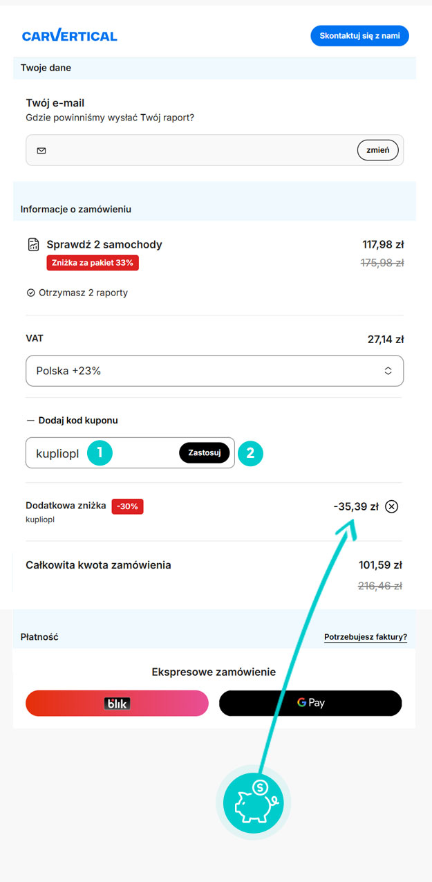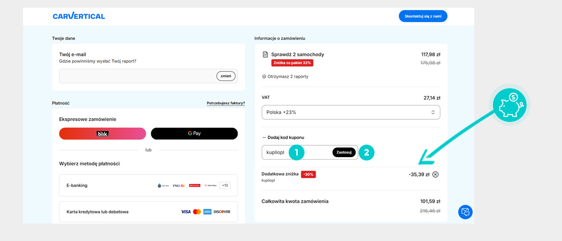 Nie wiesz dokładnie, jak działają kody rabatowe na Carvertical.com? Oto jak szybko i łatwo zastosować kody rabatowe podczas dokonywania zakupu: