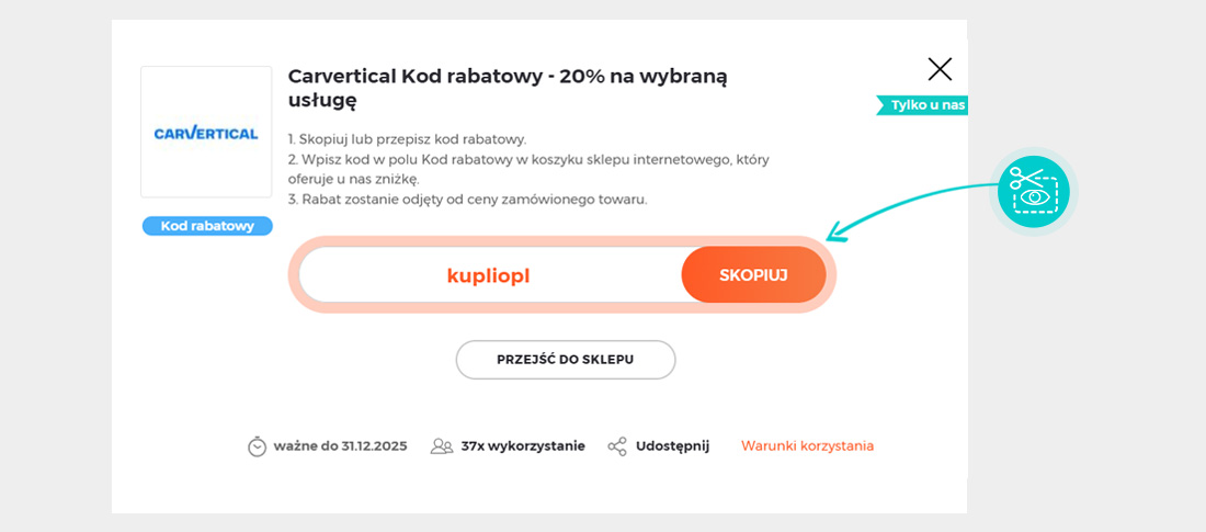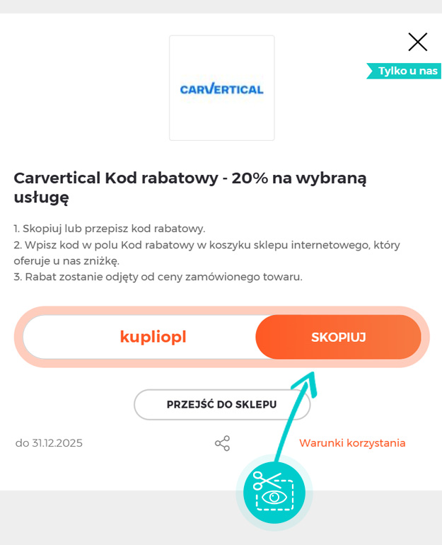 Skopiuj lub zapisz kod rabatowy i kliknij przycisk "Przejdź do sklepu". Nastąpi przekierowanie bezpieśrednio do sklepu internetowego Carvertical.com.