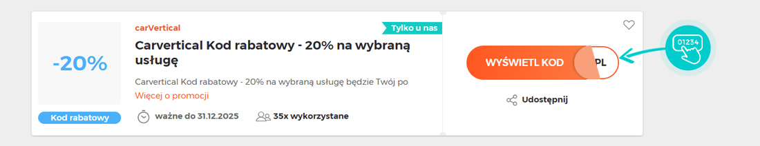 Kod promocyjny Carvertical - 35% na wybrane raporty będzie Twój po wpisaniu kodu w koszyku. Wejdź na stronę.
