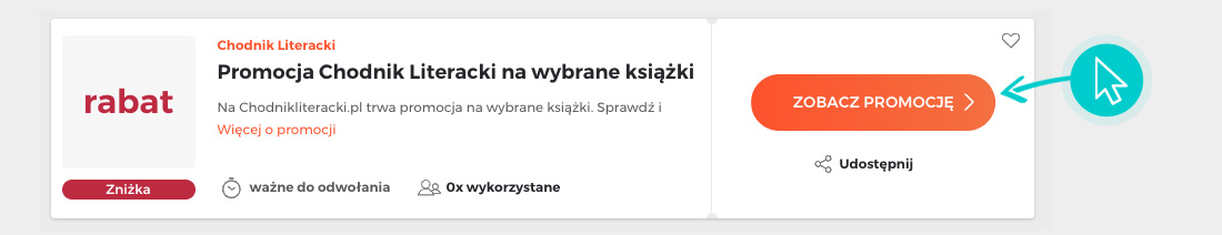 Wybierz konkretny rabat Chodnik Literacki na naszej stronie i kliknij przycisk "Zobacz promocje". Zostaniesz automatycznie przekierowany bezpośrednio do oferty specjalnej w sklepie internetowym Chodnikliteracki.pl, w którym możesz kupić produkt ze zniżką.