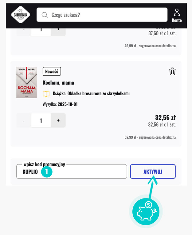 Wybierz produkt w e-sklepie Chodnikliteracki.pl który Cię interesuje, naciśnij przycisk "Kup", a produkt zostanie automatycznie dodany do koszyka. Bezpośrednio w koszyku znajdziesz pole „Kupon podarunkowy lub rabatowy” pod wybranym produktem. Wpisz tutaj skopiowany kod rabatowy lub wprowadź go ręcznie i potwierdź przyciskiem „Zastosuj”.