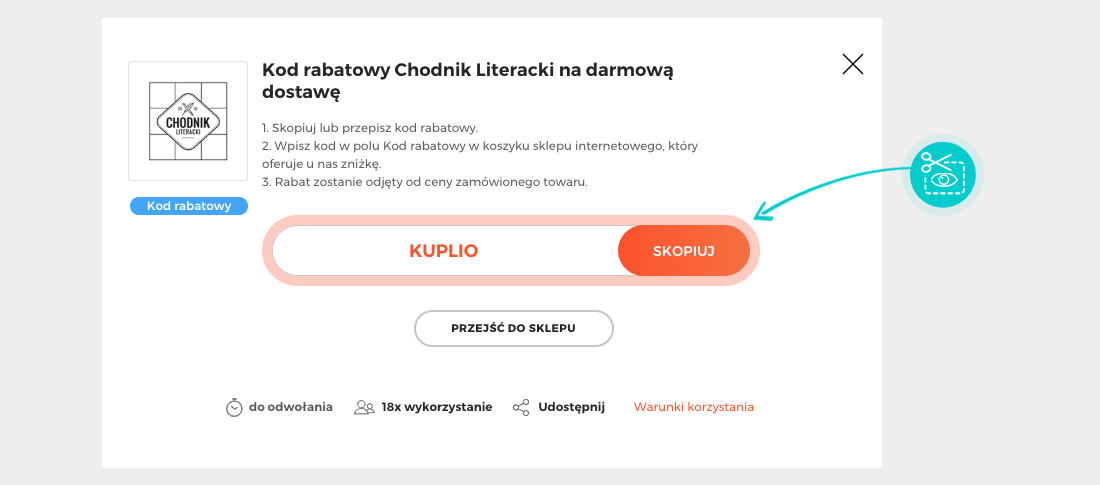 Wybierz na naszej stronie określony kod rabatowy, który chcesz zastosować w sklepie internetowym Chodnikliteracki.pl. Kliknij pomarańczowy przycisk „Wyświetl kod”.
