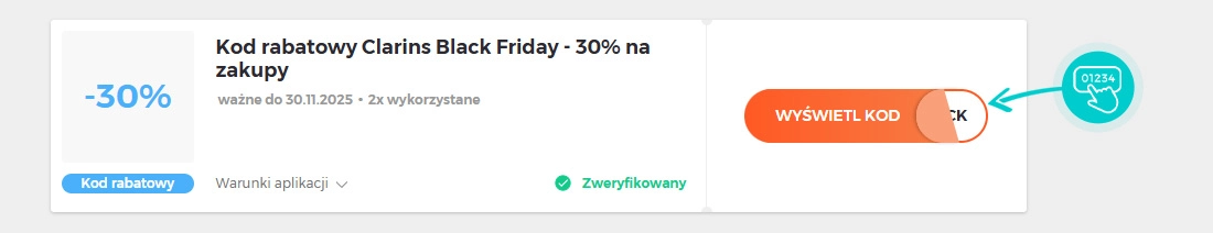 Wybierz na naszej stronie określony kod rabatowy, który chcesz zastosować w sklepie internetowym Clarins.pl. Kliknij pomarańczowy przycisk „Wyświetl kod”.