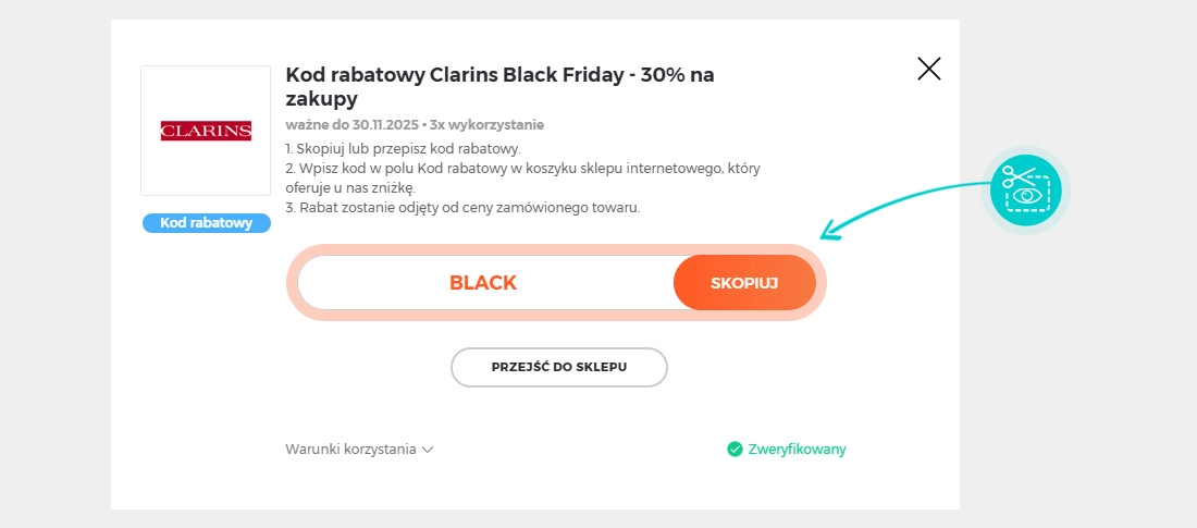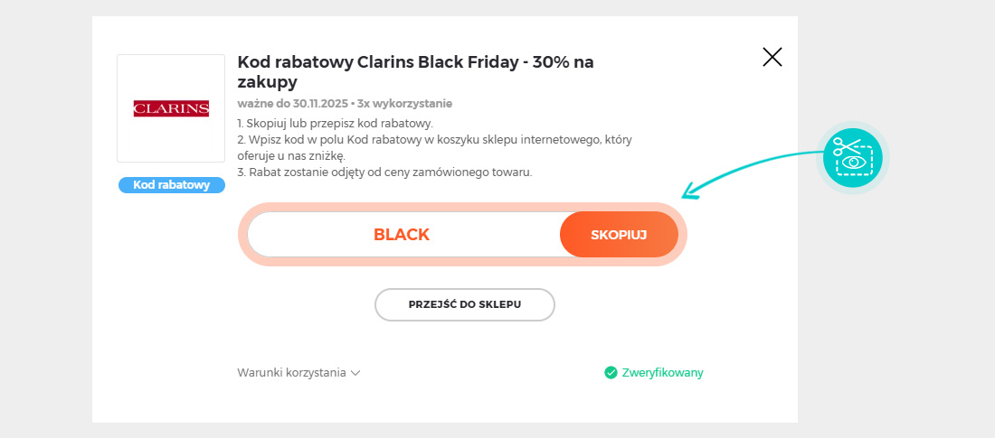 Skopiuj lub zapisz kod rabatowy i kliknij przycisk "Przejdź do sklepu". Nastąpi przekierowanie bezpieśrednio do sklepu internetowego Clarins.pl.