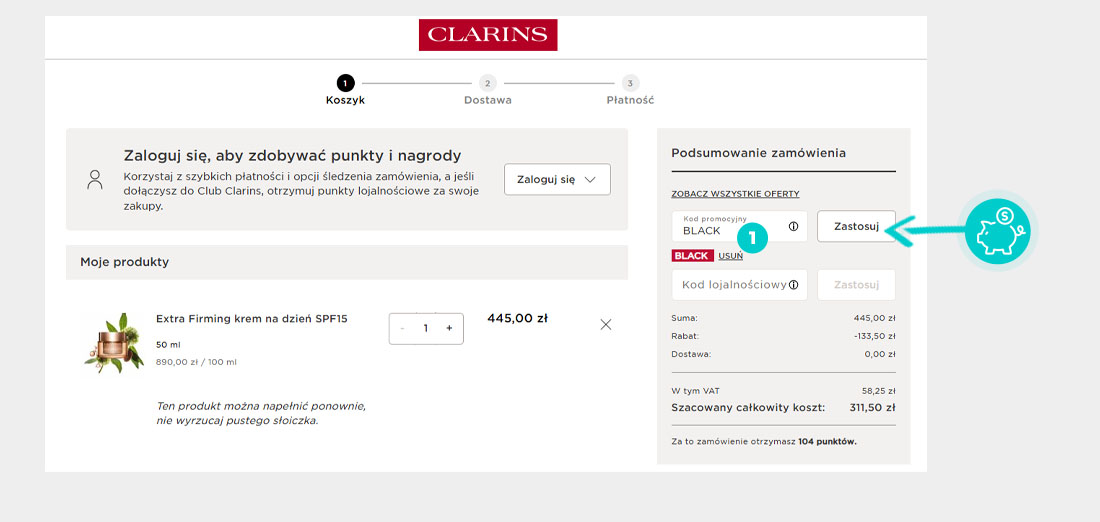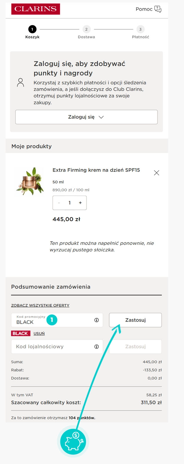Wybierz produkt w e-sklepie Clarins.pl który Cię interesuje, naciśnij przycisk "Kup", a produkt zostanie automatycznie dodany do koszyka. Bezpośrednio w koszyku znajdziesz pole „Kupon podarunkowy lub rabatowy” pod wybranym produktem. Wpisz tutaj skopiowany kod rabatowy lub wprowadź go ręcznie i potwierdź przyciskiem „Zastosuj”.