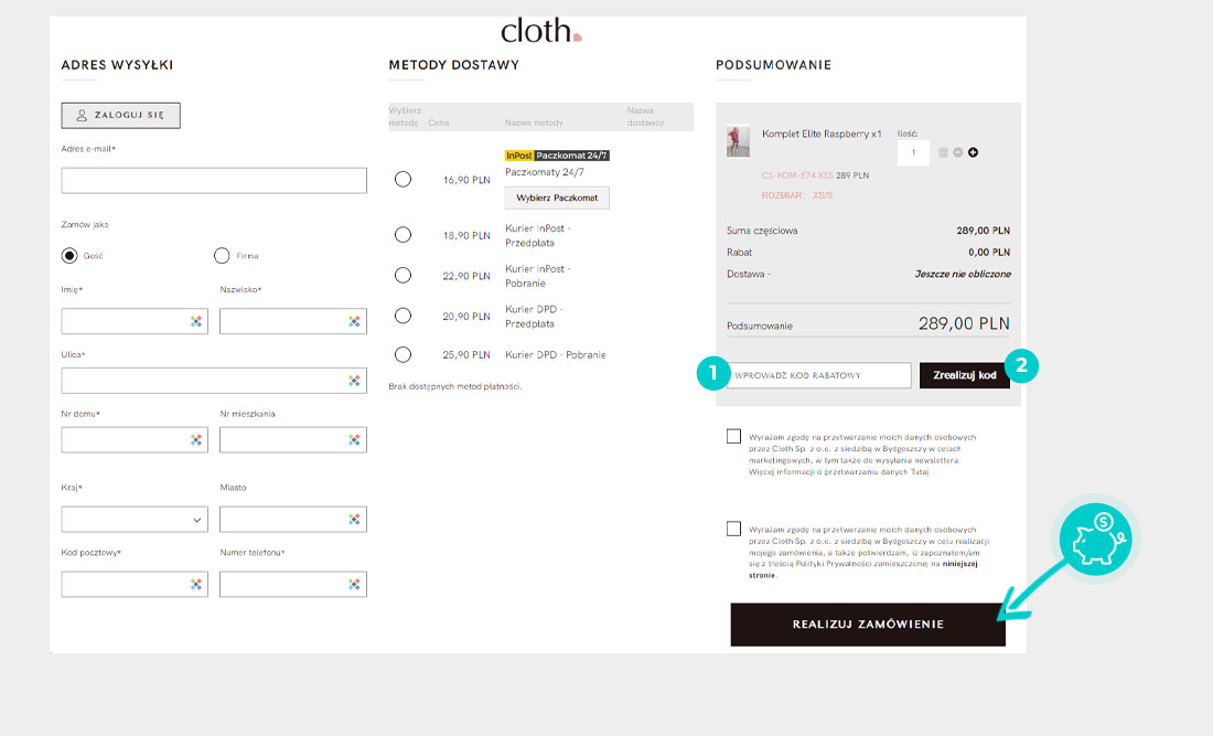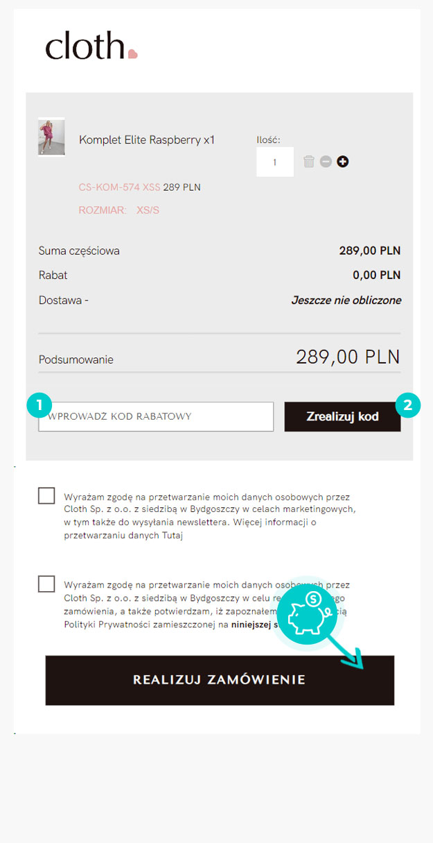 Wybierz w e-sklepie Clothstore.pl produkt, który Cię interesuje, naciśnij przycisk "Dodaj do koszyka", a produkt automatycznie zostanie dodany do Twojego koszyka z zamówieniem. Po prawej stronie, w sekcji "Twój koszyk" znajdziesz pole "Wprowadź kod rabatowy". Tutaj wklej skopiowany kod rabatowy bądź wprowadź go ręcznie, i zatwierdź przyciskiem "Zrealizuj kod", a następnie "Realizuj zamówienie".