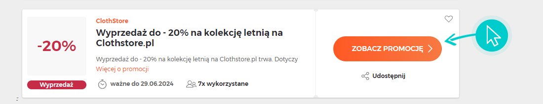 Wybierz konkretny rabat z Cloth na naszej stronie i kliknij przycisk "Zobacz promocję". Zostaniesz automatycznie przekierowany do oferty promocyjnej w sklepie internetowym Clothstore.pl, gdzie możesz kupić wybrany produkt ze świetną zniżką.