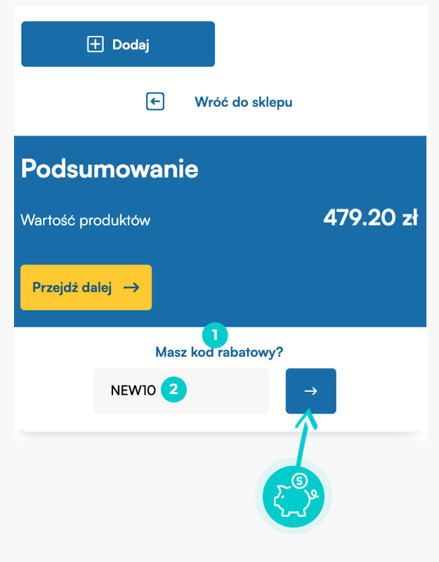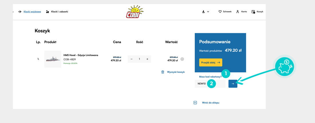 Wybierzcie w e-sklepie Cobi.pl produkt, który was interesuje, naciśnijcie przycisk "Dodaj do koszyka", a produkt automatycznie zostanie dodany do waszego koszyka z zamówieniem. Po prawej stronie, w sekcji "Koszyk" znajdziecie pole "Masz kod rabatowy?". Tutaj wklejcie skopiowany kod rabatowy bądź wprowadźcie go ręcznie, i zatwierdźcie przyciskiem, a następnie zaznaczcie "Przejdź dalej".