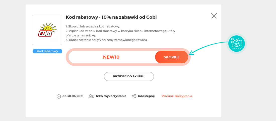 Wybierzcie na naszej stronie konkretny kod rabatowy, którego chcecie użyć w sklepie internetowym Cobi.pl. Następnie kliknijcie pomarańczowy przycisk "Wyświetl kod".