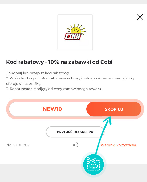 Skopiujcie lub zapiszcie kod rabatowy, a następnie kliknijcie przycisk "Przejdź do sklepu". Zostaniecie automatycznie przekierowani do sklepu internetowego Cobi.pl.