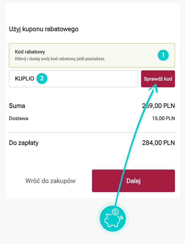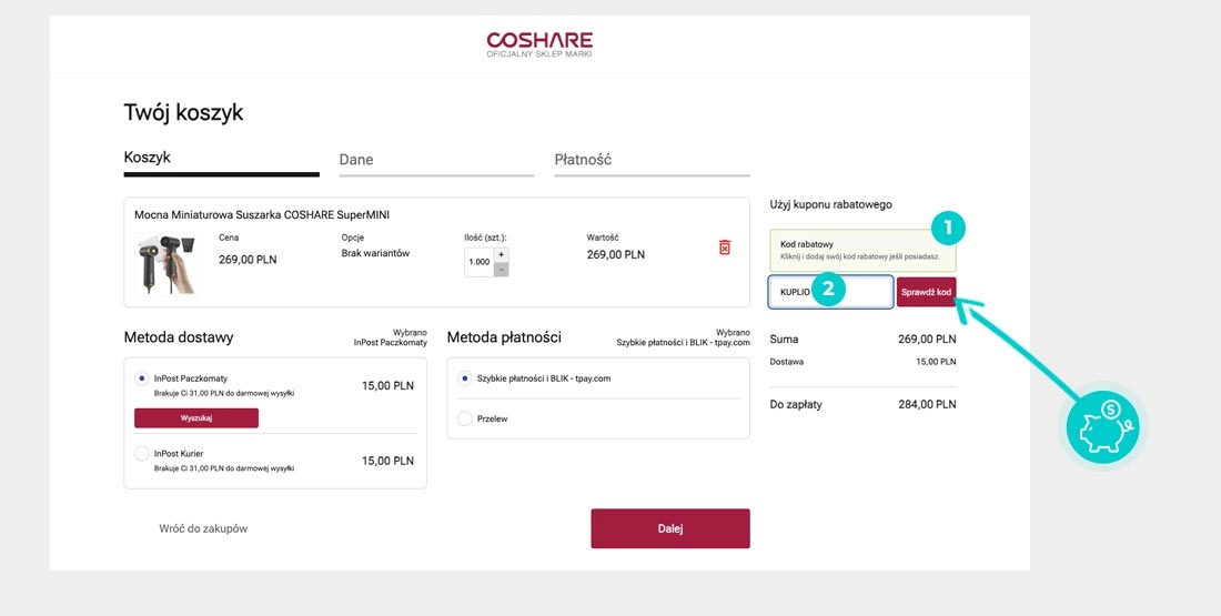 Skopiuj lub zapisz kod rabatowy i kliknij przycisk "Przejdź do sklepu". Nastąpi przekierowanie bezpieśrednio do sklepu internetowego Sklep.coshare.pl.
