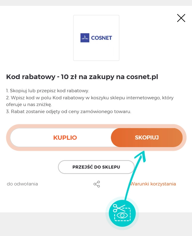 Skopiuj lub zapisz kod rabatowy i kliknij przycisk "Przejdź do sklepu". Nastąpi przekierowanie bezpieśrednio do sklepu internetowego Cosnet.pl.