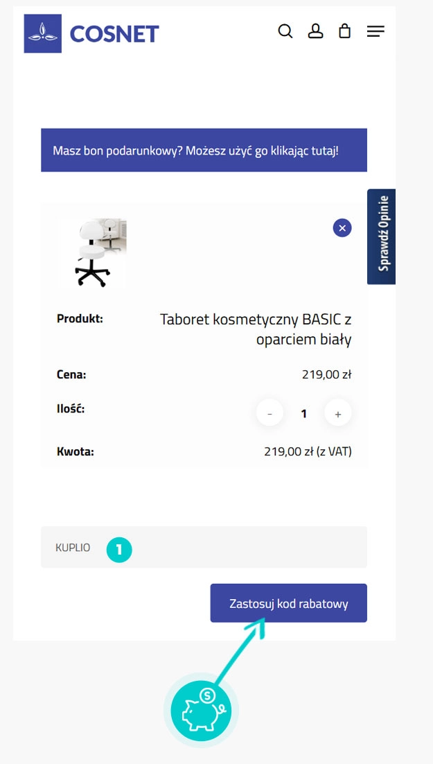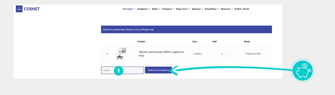 Wybierz produkt w e-sklepie Cosnet.pl który Cię interesuje, naciśnij przycisk "Kup", a produkt zostanie automatycznie dodany do koszyka. Bezpośrednio w koszyku znajdziesz pole „Kupon podarunkowy lub rabatowy” pod wybranym produktem. Wpisz tutaj skopiowany kod rabatowy lub wprowadź go ręcznie i potwierdź przyciskiem „Zastosuj”.