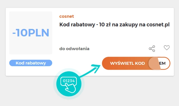 Wybierz na naszej stronie określony kod rabatowy, który chcesz zastosować w sklepie internetowym Cosnet.pl. Kliknij pomarańczowy przycisk „Wyświetl kod”.