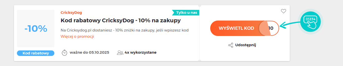 Wybierz na naszej stronie określony kod rabatowy, który chcesz zastosować w sklepie internetowym Cricksydog.pl. Kliknij pomarańczowy przycisk „Wyświetl kod”.
